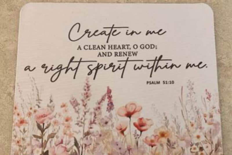 Psalm 51:10: “Create in me a Clean Heart O God; and renew a right spirit within me.” This sort of quick prayer and scripture ritual sets me on the right track for the day ahead.
